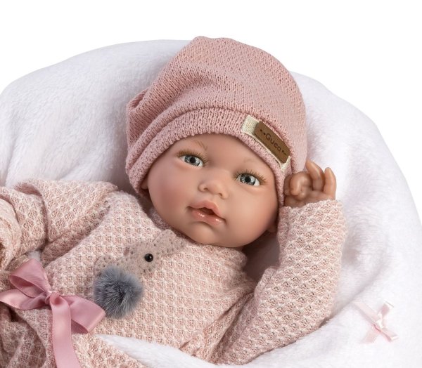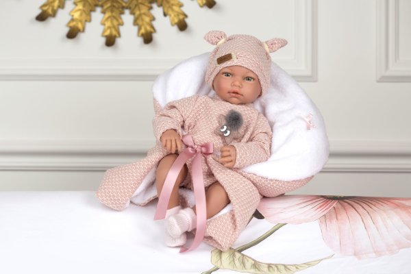 Zvuková panenka miminko s měkkým látkovým tělem, která po zatlačení na hrudník začne vydávat reálný zvuk smějícího se dítěte. Ruce a nohy jsou k tělu přichyceny kloubem. Miminko je polohovací a může i sedět. Velikost 38 cm. Ručně vyrobeno ve Španělsku, baleno v dárkové krabici. Doporučený věk od 3 let. Součástí balení je 3 x knoflíková baterie LR44 s návodem na její výměnu. Baterie jsou spotřební zboží a proto jejich vybití není důvodem k reklamaci panenky.
