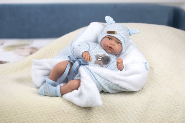 Zvuková panenka miminko s měkkým látkovým tělem, která po zatlačení na hrudník začne vydávat reálný zvuk smějícího se dítěte. Ruce a nohy jsou k tělu přichyceny kloubem. Miminko je polohovací a může i sedět. Velikost 38 cm. Ručně vyrobeno ve Španělsku, baleno v dárkové krabici. Doporučený věk od 3 let. Součástí balení je 3 x knoflíková baterie LR44 s návodem na její výměnu. Baterie jsou spotřební zboží a proto jejich vybití není důvodem k reklamaci panenky.