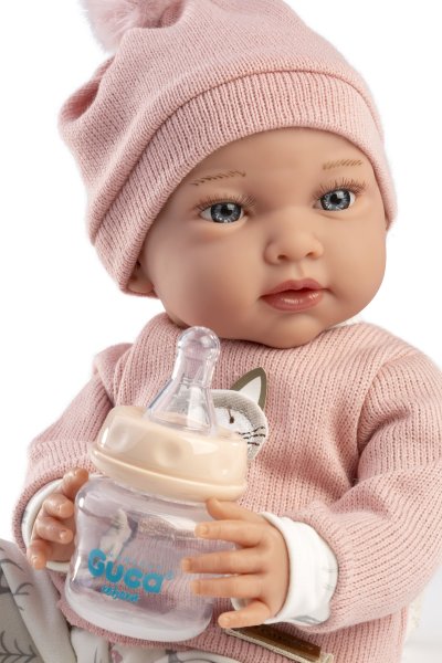Zátěžová panenka miminko bez zvuku s měkkým látkovým tělem. Ruce a nohy jsou k tělu přichyceny kloubem. Miminko je polohovací a může i sedět, avšak díky zatížení hlavičky jsou její pohyby odlišné od ostatních miminek. Hlavička se jí na krku pohybuje v závislosti na celkové manipulaci s panenkou a v náručí se chová jako skutečné miminko, kterému je potřeba hlavičku ještě přidržovat. Díky zátěžovým výplním v hlavě a na zadečku má tento typ panenky miminka vyšší váhu oproti ostatním (cca 1800 g) a je vnímána jako manipulační panenka, která je vhodná nejen pro děti, ale i pro seniory nebo jako pomůcka pro inkluzi a osoby se speciálními potřebami. Tyto panenky se používají v ergoterapii, kde pomáhají rozvíjet jemnou motoriku a koordinaci u dětí i dospělých. Jsou také výborným pomocníkem při práci s lidmi s demencí, kde navozují klientům pocity klidu a bezpečí. Zátěžová výplň panenky: látkové pytlíky plněné křemičitým pískem. Velikost 42 cm. Ručně vyrobeno ve Španělsku, baleno v dárkové krabici. Doporučený věk od 3 let.