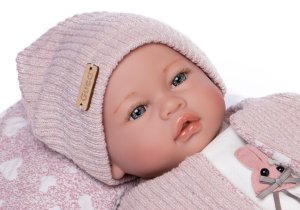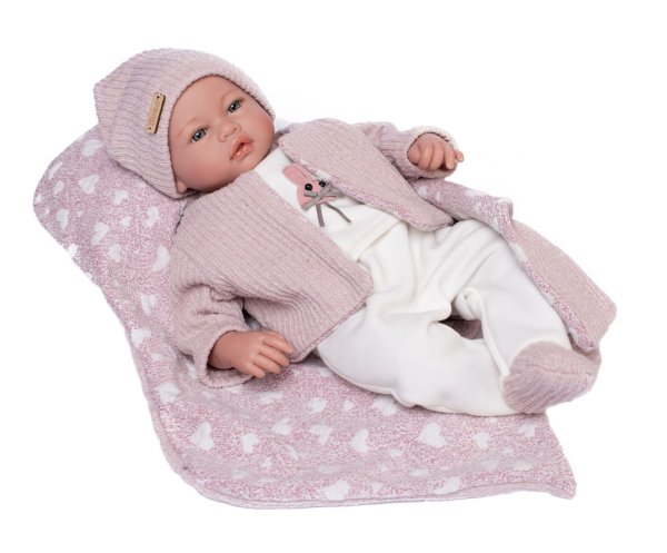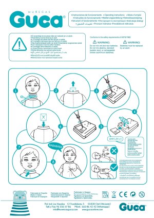 Zvuková panenka miminko s měkkým látkovým tělem, která po zatlačení na hrudník začne vydávat reálný zvuk smějícího se dítěte. Ruce a nohy jsou k tělu přichyceny kloubem. Miminko je polohovací a může i sedět. Velikost 46 cm. Ručně vyrobeno ve Španělsku, baleno v dárkové krabici. Doporučený věk od 3 let. Součástí balení je 3 x knoflíková baterie LR44 s návodem na její výměnu. Baterie jsou spotřební zboží a proto jejich vybití není důvodem k reklamaci panenky.