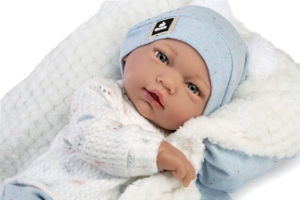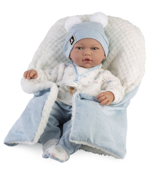 Panenka miminko bez zvuku s měkkým látkovým tělem. Ruce a nohy jsou k tělu přichyceny kloubem. Miminko je polohovací a může i sedět. Dudlík v balení slouží pouze jako doplněk. Velikost 38 cm. Ručně vyrobeno ve Španělsku, baleno v dárkové krabici. Doporučený věk od 3 let.