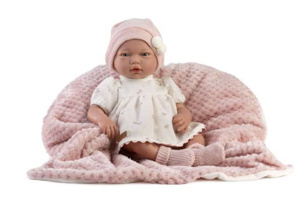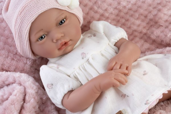 Panenka miminko bez zvuku s měkkým látkovým tělem. Ruce a nohy jsou k tělu přichyceny kloubem. Miminko je polohovací a může i sedět. Velikost 38 cm. Ručně vyrobeno ve Španělsku, baleno v dárkové krabici. Doporučený věk od 3 let.