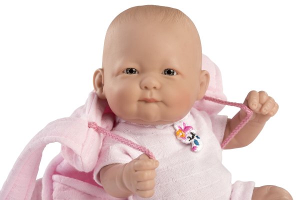 Miminko bez zvuku s vinylovým tělem s možností koupání, na kterém je zachycen doslova každý detail dětského tělíčka včetně roztomilých miminkovských faldíků a pohlaví. Ruce a nohy jsou k tělu přichycené kloubem. Miminko je polohovací a může i sedět. Velikost 25 cm. Ručně vyrobeno ve Španělsku, baleno v dárkové krabici. Doporučený věk od 3 let.