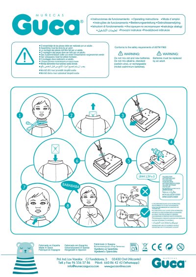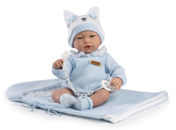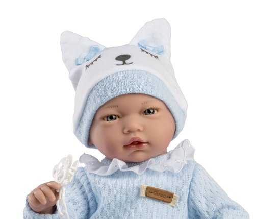 Zvuková panenka miminko s měkkým látkovým tělem, která po zatlačení na hrudník začne vydávat reálný zvuk smějícího se dítěte. Ruce a nohy jsou k tělu přichyceny kloubem. Miminko je polohovací a může i sedět. Dudlík v balení slouží pouze jako doplněk. Velikost 38 cm. Ručně vyrobeno ve Španělsku, baleno v dárkové krabici. Doporučený věk od 3 let. Součástí balení je 3 x knoflíková baterie LR44 s návodem na její výměnu. Baterie jsou spotřební zboží a proto jejich vybití není důvodem k reklamaci panenky.