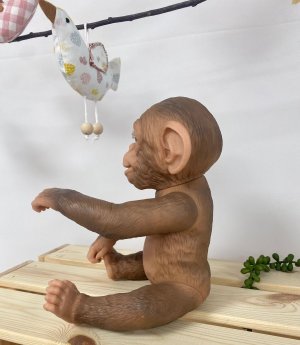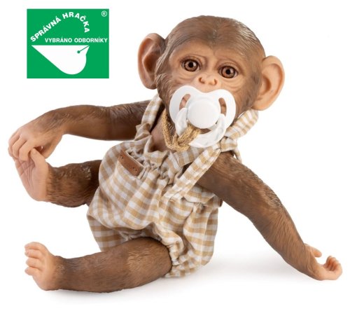Veselé a roztomilé opičí miminko bez zvuku s vinylovým tělem s možností koupání, na kterém je zachycen věrohodně každý detail tohoto zvířecího mláďátka včetně různých záhybů, kromě pohlaví. Opičku lze koupat, ale je potřeba dát pozor, aby se jí nenamočily řasy. Odlepené řasy nejsou pak důvodem k reklamaci. Ruce a nohy jsou k tělu přichycené kloubem. Opičí miminko je polohovací a může i sedět nebo se dá pověsit za ruce nebo nohy. Dudlík v balení slouží pouze jako doplněk. Velikost 32 cm. Ručně vyrobeno ve Španělsku, baleno v dárkové krabici. Doporučený věk od 3 let.