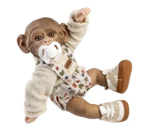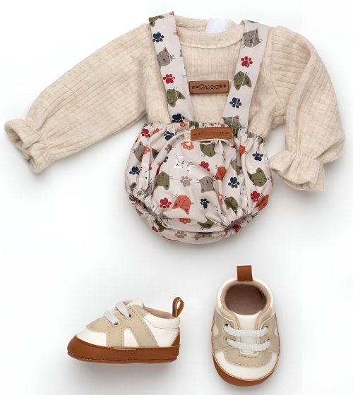 3dílný set: 2 kusy oblečení a botičky pro opičku miminko REBORN velikosti 32 cm. Vyrobeno ručně ve Španělsku, baleno v igelitovém obalu na kartonové podložce. Doporučený věk od 3 let.