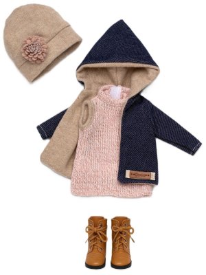 5dílný set: 4 kusy oblečení a botičky pro panenku Penelope velikosti 34 cm. Vyrobeno ručně ve Španělsku, baleno v igelitovém obalu na kartonové podložce. Doporučený věk od 3 let.