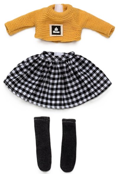 4 kusy oblečení pro panenku Penelope velikosti 34 cm. Vyrobeno ručně ve Španělsku, baleno v igelitovém obalu na kartonové podložce. Doporučený věk od 3 let.