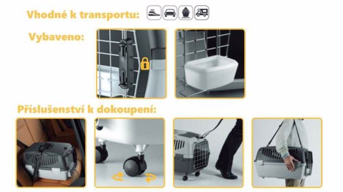 - Vybavena uzamykacím systémem, madlem pro přenášení a nádobkou na vodu nebo krmivo