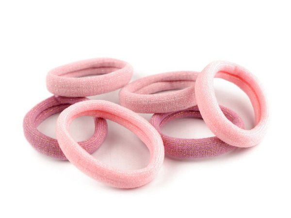 Gumičky do vlasů vypadají velice elegantně - díky všitým lurexovým vláknům se dokonale třpytí. Jsou vhodné na vytvoření jednoho či více copů. Gumičky výborně drží na hrubých i jemných vlasech. V jedné sadě je 6 gumiček. Vnitřní průměr gumičky je cca 3,5 cm a maximální délka obvodu po roztažení je cca 16 cm. Gumičky jsou na papírové kartě, která má otvor na zavěšení na prodejní stojan.