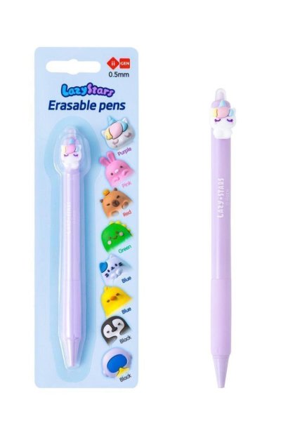 Klikací gumovací gelové pero s motivem Jednorožce. Tloušťka hrotu 0,5 mm, inkoust fialový, na blistr kartě.
