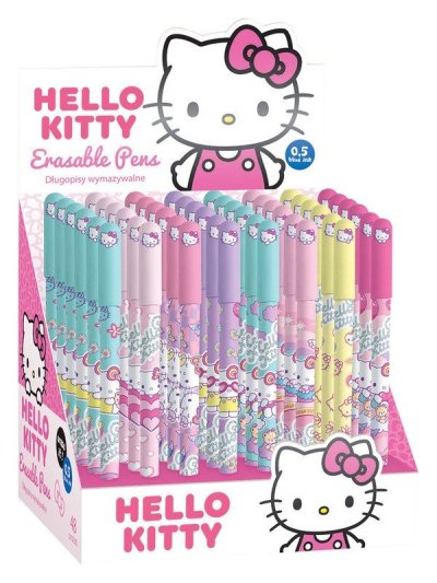 Konec chybám a škrtání v sešitech. Prostě je vymaž a přepiš. Pevná pryž na konci pera a jedinečné složení inkoustu zaručuje jednoduché a opakované gumování. K dispozici náhradní náplň.<br><br>Kolekce gumovatelných per v matném provedení a víčkem s motivem Hello Kitty.<br><br>• šířka stopy: 0,5 mm<br>• dostupná náhradní náplň R02000PTR<br>• 6 motivů<br>• barva náplně: modrá<br>• obsah balení: 48 ks/displej<br>