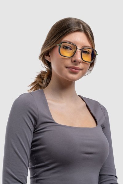 Kancelářské brýle s jantarovými skly a jedinečným designem, určené zejména pro dlouhou práci či hraní na počítači. Tento retro-futuristický styl hranatých obrouček má přední část z nerezové oceli a nylonu zakončenou olivovými kovovými nožičkami. Brýle blokují 65 % modrého světla a 100 % ultrafialového záření, díky čemu minimalizují zatížení očí a celkovou únavu. O maximální komfort se postarají ergonomicky tvarovaná sedla, zatímco pevná konstrukce rámu a boční štíty zajistí správnou optickou stabilitu.