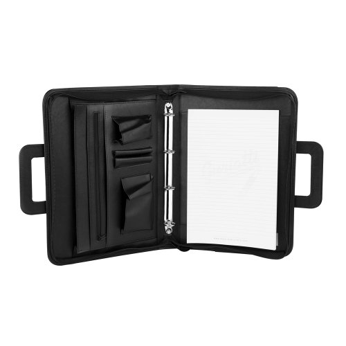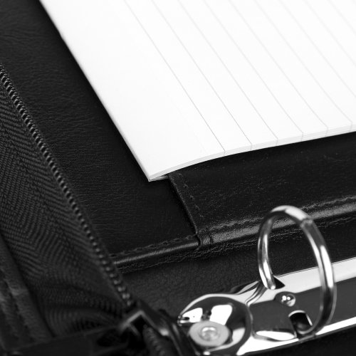 Diplomatka Safe vám pomůže mít všechny důležité věci přehledně uspořádané. Obsahuje prostor pro blok a psací potřeby, přihrádky na vizitky, kalkulačku nebo telefon, a navíc praktické kapsy na zip pro drobné příslušenství. Díky 4kroužkovému mechanismu snadno připevníte dokumenty a další komory vám umožní uložit katalog nebo knihu.