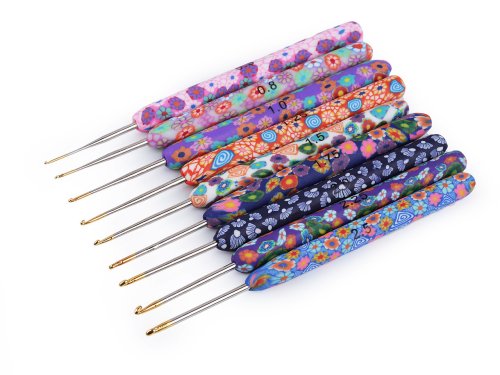 S barevnými háčky bude háčkování hned veselejší. Jejich silikonovou rukojeť zdobí různé květinové vzory. Pohodlně se drží v ruce. Velikost háčků se řídí podle čísel - háček s nejnižším číslem je nejslabší, naopak háček s nejvyšším číslem je nejsilnější.