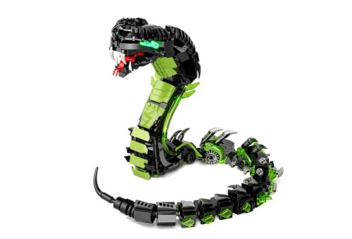Hlava kobry je propracovaná do detailu, s výraznými čelistmi a červeným jazykem, který umocňuje její divoký výraz. Oči hada jsou vybaveny svítícími prvky, které ve tmě září, což přidává na autentičnosti a přitažlivosti modelu. Mechanické části na těle hada, například ozubená kolečka a klouby, podtrhují technický charakter stavebnice a zvyšují její interaktivitu.