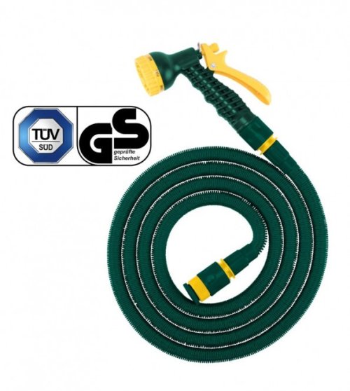 Tato praktická flexi hadice má vlastnost automatickéo prodloužení a zkrácení délky. Při otočení kohoutkem se hadice naplní vodou a vznikne v ní tlak, který je prodlouží na maximální délku 16.5 metrů. Po vypnutí kohoutku a vypuštění vody z hadice klesne vnitřní tlak a hadice se stáhne na minimální délku 5 metrů. Součástí balení je postřikovací pistole s 8-mi funkcemi postřiku a sada konektorů, pomocí kterých je jednodušše připojíte k vodovodu. Kvalitní hadice, která se nesukuje, neobsahuje PVC, šetří místo, je lehká a současně pevná. EAN 4016002066353