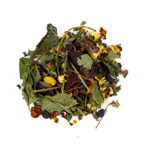 Složení: měsíček, list jahodníku, ibišek, jablko, slaměnka, sléz, rajče, aronie, banán, šípek.
