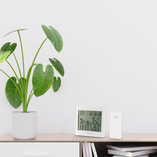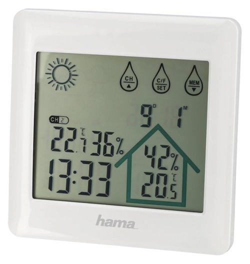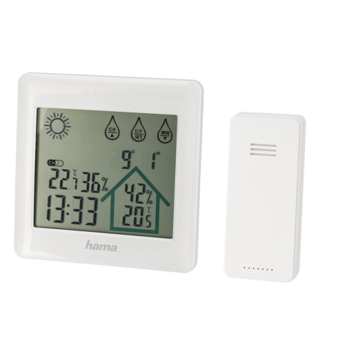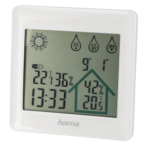 Hama Action; Set složený ze základny a bezdrátového čidla nabízí digitální měření vnitřní i venkovní teploty a vlhkosti vzduchu .