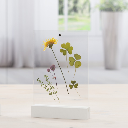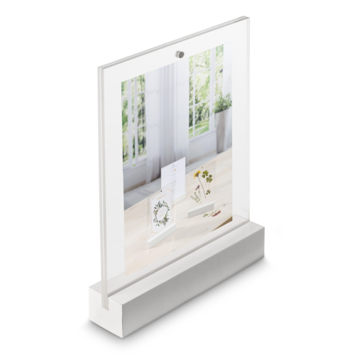 • moderní akrylový stojánek na fotografie s bílou základnou z MDF materiálu