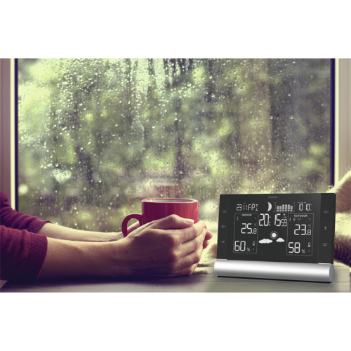 digitální zobrazení času, teploty, vlhkosti a tlaku vzduchu, předpovědi počasí a fáze měsíce