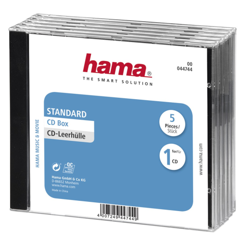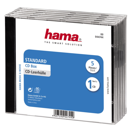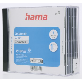 Hama CD Standard box, standardní obal na 1 CD/DVD, průhledný/černý, balení 5 ks (cena za balení)