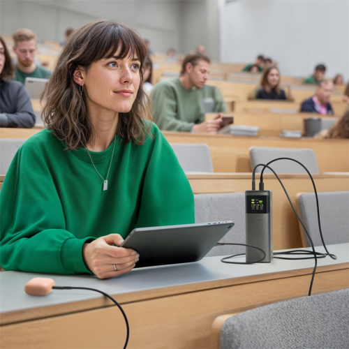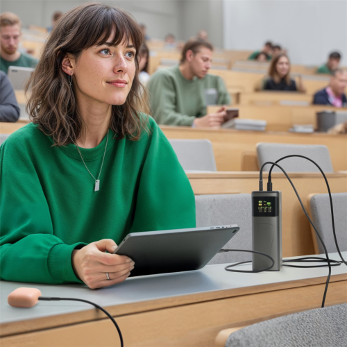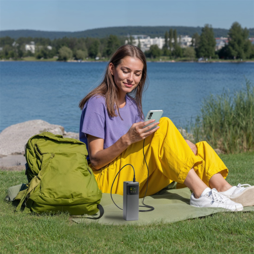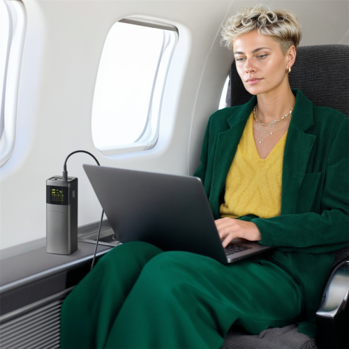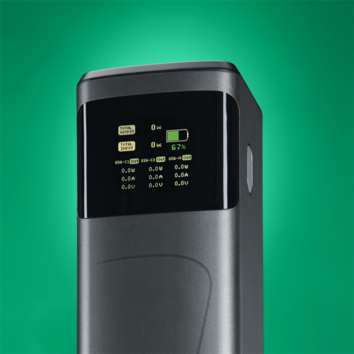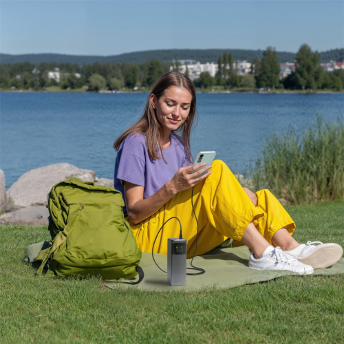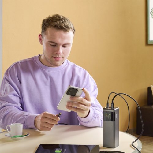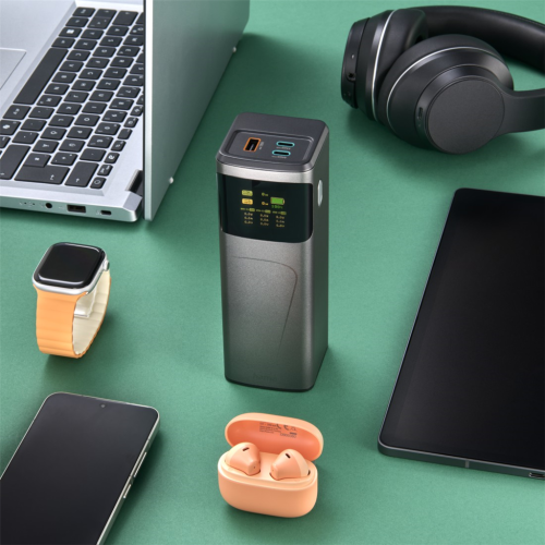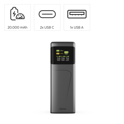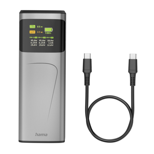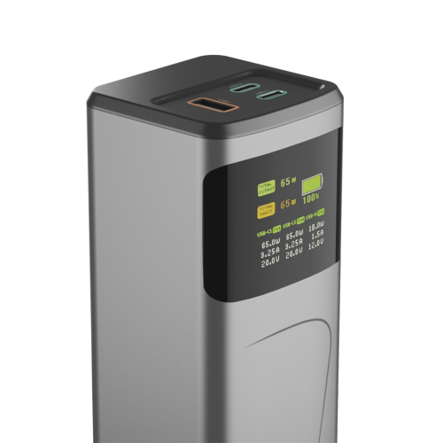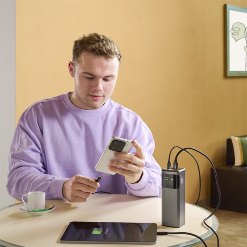 Poznámka: Powerbanka má celkový výstupní výkon max. 65 W. Připojíte-li dvě zařízení k oběma USB-C zásuvkám, výkon se rozdělí na 45 W a 20 W. Připojíte-li zařízení ke všem třem zásuvkám, výkon se rozdělí na 45 W pro jednu USB-C zásuvku, 7,5 W pro druhou USB-C a 7,5 W pro USB-A zásuvku.