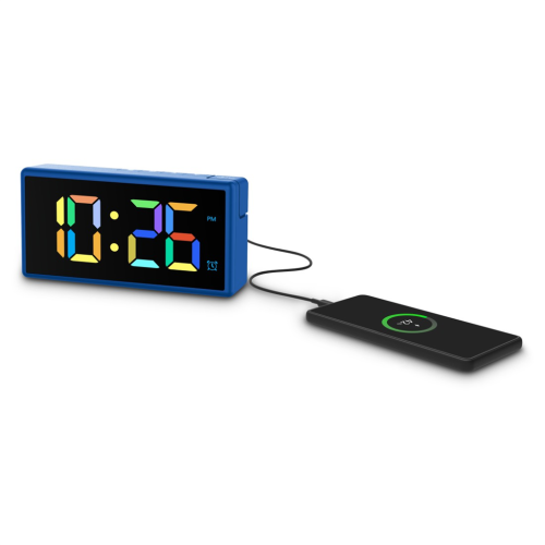 Hama Ibiza, digitální budík, vícebarevný displej, USB napájení, USB s funkcí nabíjení, modrý