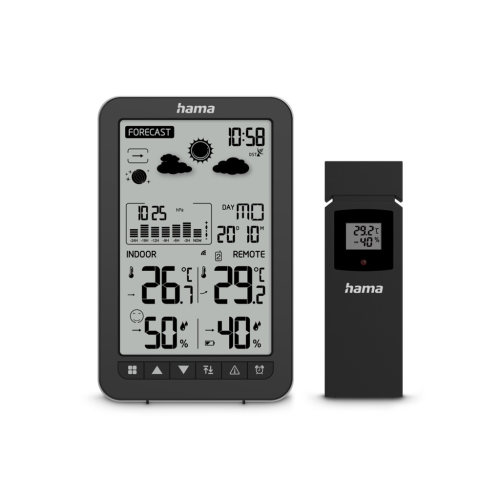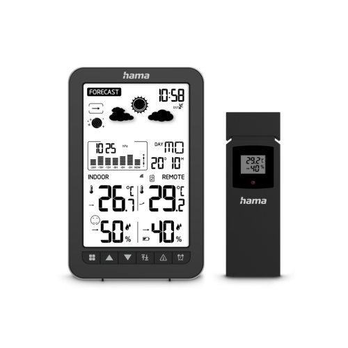 - 2dílný set: základna + bezdrátový senzor; kompaktní portrétové provedené, intuitivní ovládání pomocí tlačítek na přední straně - digitální zobrazení času, data, teploty, vlhkosti a tlaku vzduchu, předpovědi …