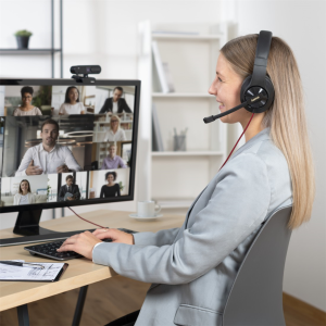 • kancelářský stereo headset s nastavitelným ramenem mikrofonu a USB-A připojením