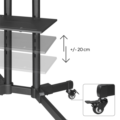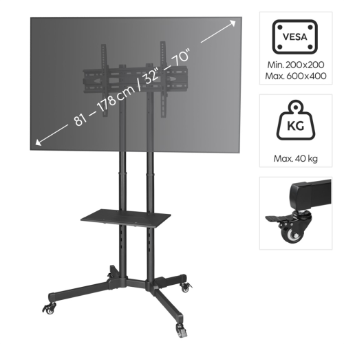 - samostatně stojící podlahový stojan na kolečkách s naklápěcím televizním držákem - vhodné pro televizory s úhlopříčkou cca 81 až 190 cm (32" až 75") - pevná police pro přehrávač, přijímač nebo jiné …