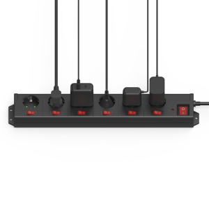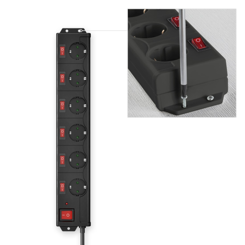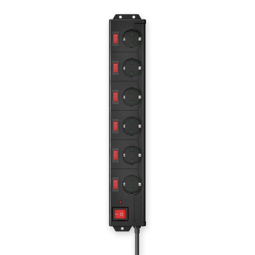 - 1 hlavní a 6 jednotlivých vypínačů s červenými kontrolkami; kontrolka přepěťové ochrany