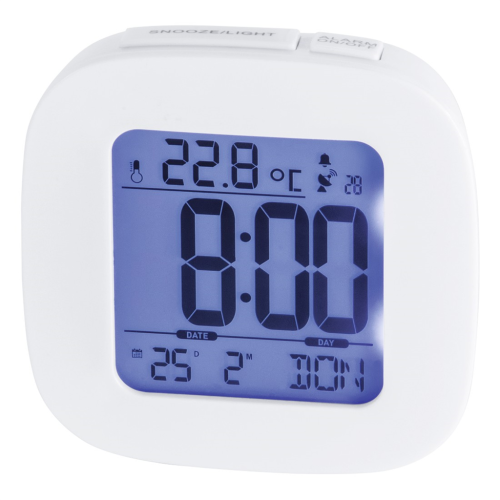 • digitální zobrazení času, času buzení, data (den/měsíc) a teploty (v °C nebo °F)