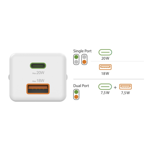 univerzální USB nabíječka pro až 2 zařízení umožňující nabíjení/napájení přes USB konektor malá a lehká nabíječka, neblokuje zásuvky, ideální na cesty technologie USB Power Delivery a Qualcomm Quick …