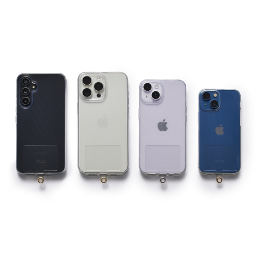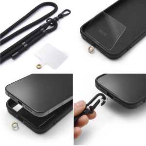 Sundejte kryt, vložte průhlednou destičku dovnitř krytu, část s kovovým kroužkem na karabinku vytáhněte přes otvor pro nabíjecí konektor. Kryt nasaďte zpět na telefon. Připevněte šňůrku. Destičku můžete nechat vloženou v krytu, i když šňůrku zrovna nepoužíváte.