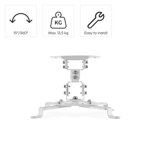 - jednoduchý držák projektoru pro montáž na strop - 4 nastavitelná ramena pro projektory s roztečí závitů 5,4 až 32 cm - podélné a příčné naklápění: +/- 15 st. - otáčení: 360 st. - max. nosnost: 13,5 …