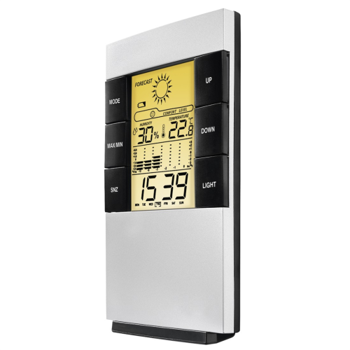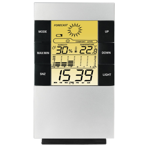 • digitální zobrazení teploty, vlhkosti vzduchu, času, dne v týdnu, data, vývoje teploty vzduchu a předpovědi počasí