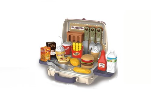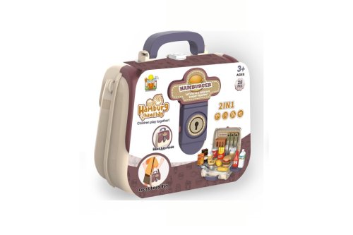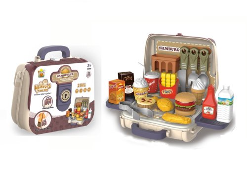 Hambugerová sada obsahuje příbor, jídlo, kvu, mléko, čaj. Všechny doplňky jsou uschované v praktickém kufříku.