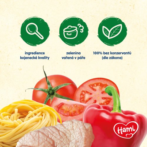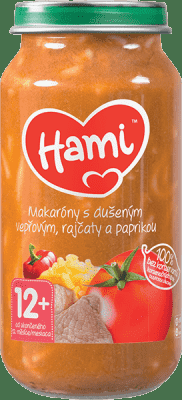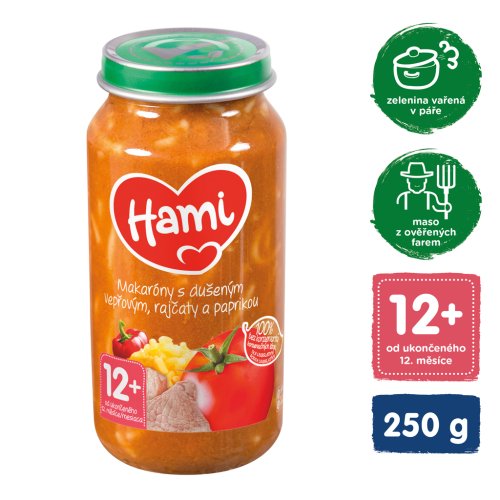 Hami Makaróny s dušeným vepřovým, rajčaty a paprikou (250 g) je masozeleninový příkrm vhodný od ukončeného 12. měsíce.