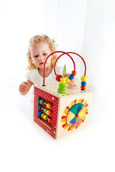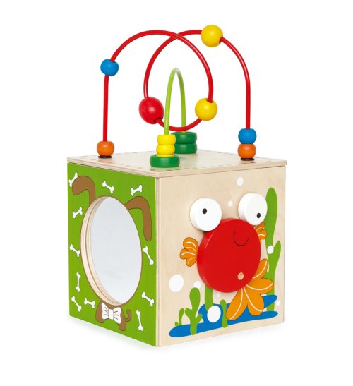 Motorická kostka, která rozvíjí kreativní schopnosti, fantazii dítěte a jemnou motoriku. Hračka příznivě působí na rozvoj jemné motoriky a bude Vaše děti bavit. Motorická kostka má hned několik aktivit. Na horní straně hračky je labyrint s dřevěnými kuličkami a umělohmotnými kroužky. Po stranách děti upoutají barevné hodiny s otočným dílkem, počítadlo s barevnými korálkami, veselá rybička s otočnými dílky. Líbit se bude i bezpečné zrcátko, ve kterém se dítě může vidět. Přibližná velikost hračky: 35 x 20 x 20 cm. Balení obsahuje dřevěnou motorickou kostku. Vhodné pro děti od 2 let.
