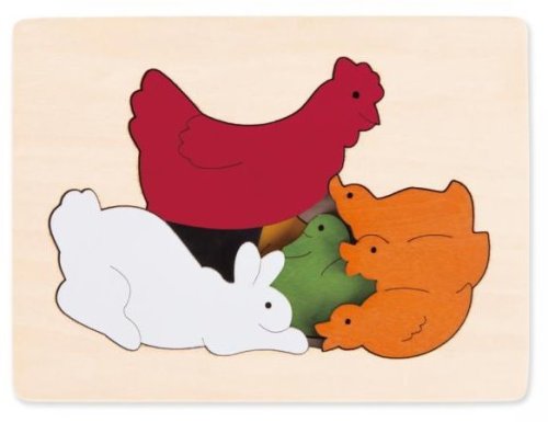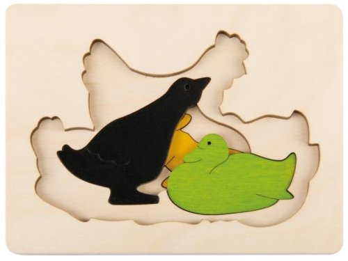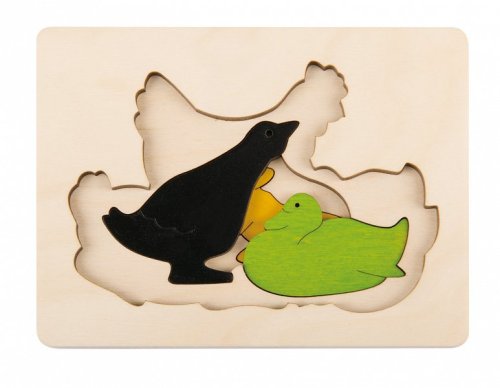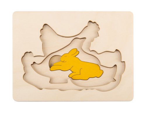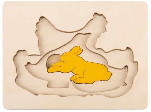 Dřevěné puzzle s více vrstvami s motivem zvířátek. V první vrstvě je slepička se svými kuřátky, druhé vrstvě je kachna s kačerem a ve třetí je malý zajíček. Dílky se umisťují do dřevěné desky s vyfrézovaným obrysem. Skládání puzzle rozvíjí jsou jemnou motoriku, logické myšlení a koordinaci oko-ruka. Vkládací puzzle je vyrobeno z kvalitního dřevěného materiálu a je vhodné pro děti od 3 let. Poznámka: Doporučujeme uschovat zadní obalovou stranu jako předlohu pro skládání. Rozměr složeného puzzle cca 15 x 11 cm