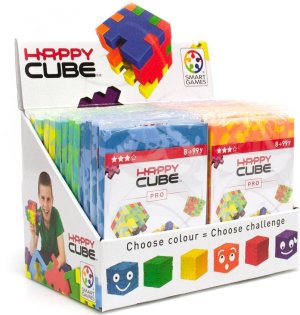 Prudce zábavné a návykové - tak by šlo charakterizovat pěnové 3D puzzle s názvem Happy Cube® (Veselá kostka). Procvičte si mozek a pusťte se do úžasného světa Happy Cube s různými stupni obtížnosti. Pořádejte turnaje s přáteli nebo s rodinou a skvěle se bavte! Skládání 3D puzzle kostky Happy Cube Vám provětrá mozkové závity, zlepšuje koncentraci, rozvíjí prostorové myšlení, koordinaci a snižuje stres. Základním úkolem je sestavit dokonalou kostku z šesti stejně barevných dílů. Není to ovšem tak jednoduché, jak by se na první pohled mohlo zdát. Obvykle existuje pouze jediný způsob, jak kostku složit. Dalším úkolem je naskládat jednotlivé dílky Happy Cube zpět do dvojrozměrného rámu, ve kterém byly dodány. Třetím úkolem a opravdovou výzvou je pak složit větší a složitější trojrozměrnou sestavu přidáním dalších druhů kostek stejné skupiny. Některé struktury jsou těžší než ostatní a jejich příklady naleznete na obalu každého výrobku Happy Cube. K dispozici jsou čtyři skupiny 3D puzzle kostek Happy Cube, z nichž každá obsahuje 6 různých kostek. Každá skupina má unikátní barevnou strukturu, styl a úroveň obtížnosti. V rámci každé skupiny jsou kostky a tedy i obtížnost rozlišeny podle barev. K dispozici je tedy celkem 24 různých kostek. Čtyři skupiny kostek Happy Cube:
