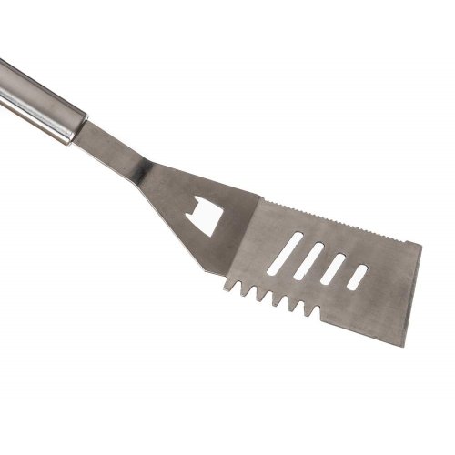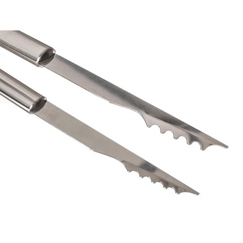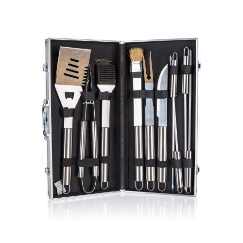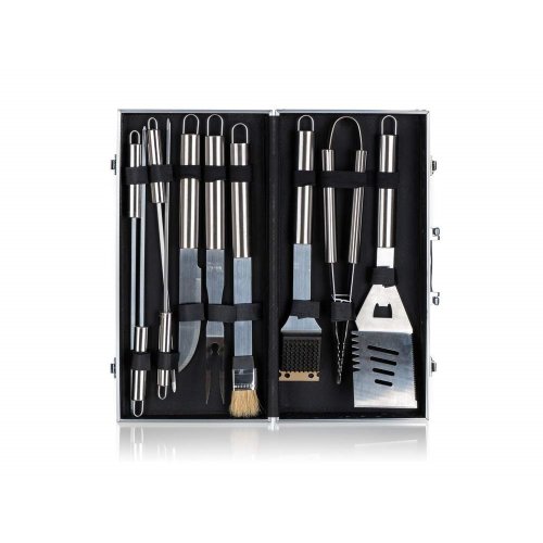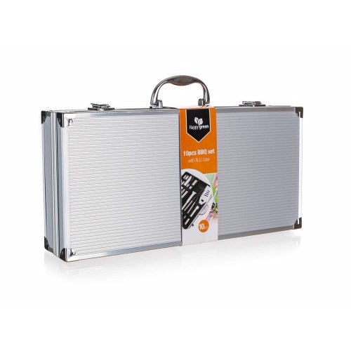 10dílná sada grilovacího příslušenství balená v luxusním hliníkovém kufříku obsahuje: čístící drátěný kartáč, grilovací zubaté kleště, multifunkční obracečku, porcovací nůž, vidlička se 2 hroty, 4 grilovací jehlice a štětec. Sada je balena v masivním hliníkovém kufříku a obsahuje základní nářadí potřebné při grilování, které je vybaveno očky pro možnost zavěšení. Velikost jednotlivých dílů: obracečka 43 cm, kleště 40,5 cm, kartáč 40,5 cm, štětec 44 cm, vidlice 42 cm, nůž 39 cm a jehlice na špíz 42 cm.