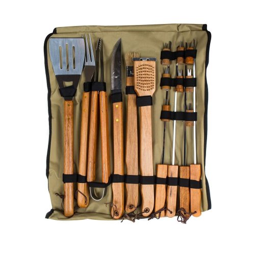 18dílná sada grilovacího náčiní s dřevěnou rukojetí balená v praktickém textilním obalu obsahuje: čístící drátěný kartáč, grilovací zubaté kleště, obracečku, porcovací nůž, vidličku se 3 hroty, 4 grilovací jehlice, 8 napichovátek na grilovanou kukuřici a štětec. Sada obsahuje základní nářadí potřebné při grilování, které je vybaveno poutky pro zavěšení.