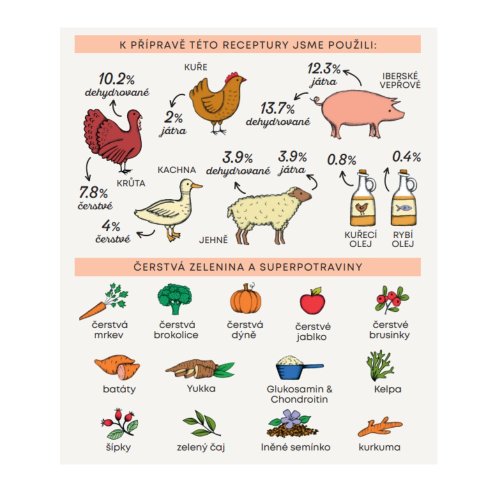 Složení: dehydrované iberské vepřové 19,6 %, čerstvý losos 12,2 %, celý zelený hrášek, čerstvé vykostěné vepřové 12 %, jablečná vláknina, dehydrované brambory, čerstvý vykostěný králík, řepné řízky, čerstvý vykostěný divočák 4 %, dehydratovaná zvěřina 4 %, dehydrované sladké brambory 3,8 %, rybí hydrolyzát 1,9 %, kuřecí olej (chráněno přírodními tokoferoly) 1,2 %, lněné semínko (přírodní zdroj mastných kyselin ω3) 0,5 %, kvasnice (Saccharomyces cerevisiae), rybí olej (chráněno přírodními tokoferoly) 0,4 %, minerální látky, čerstvá brokolice 1000 mg/kg, čerstvá dýně 1000 mg/kg, čerstvá mrkev 1000 mg/kg, čerstvá jablka 1000 mg/kg, hydrolyzovaná buněčná stěna kvasnic (zdroj MOS) 1000 mg/kg, čekanka (zdroj FOS) 1000 mg/kg, glukosamin 500 mg/kg, výtažek z mandarinky 500 mg/kg, chondroitin 300 mg/kg, Yucca schidigera 200 mg/kg, Řasa Kelpa 30 mg/kg, klikva celé plody 30 mg/kg, šípky (bohaté na vitamín C) 30 mg/kg, zelený čaj 30 mg/kg, kurkuma 30 mg/kg.