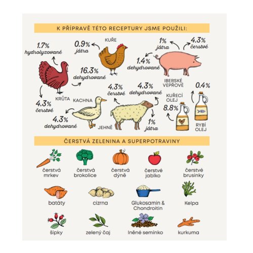 Složení: dehydrovaná krůta 16,3 %, dehydrované brambory, celý zelený hrášek, kuřecí olej (chráněno přírodními tokoferoly) 8,8 %, jablečná vláknina, dehydrovaná kachna 4,3 %, čerstvá jehněčí játra 4,3 %, čerstvá vykostěná krůta 4,3 %, dehydrované jehněčí 4,3 %, celá cizrna 4,3 %, čerstvé vykostěné vepřové 4,3 %, dehydrované sladké brambory 3,6 %, rohovníku (svatojánský chléb), hydrolyzát z krůtích jater 1,7 %, dehydrované iberské vepřové 1,4 %, hydrolyzát z vepřových jater 1 %, hydrolyzát z jehněčích jater 1 %, hydrolyzát z kuřecích jater 0,9 %, lněné semínko (přírodní zdroj mastných kyselin ω3) 0,6 %, řepné řízky, rybí olej (chráněno přírodními tokoferoly) 0,4 %, kvasnice (Saccharomyces cerevisiae), minerální látky, čerstvá brokolice 1000 mg/kg, čerstvá dýně 1000 mg/kg, čerstvá jablka 1000 mg/kg, čerstvá mrkev 1000 mg/kg, glukosamin 1000 mg/kg, chondroitin 600 mg/kg, hydrolyzovaná buněčná stěna kvasnic (zdroj MOS) 500 mg/kg, čekanka (zdroj FOS) 500 mg/kg, výtažek z mandarinky 500 mg/kg, Yucca schidigera 200 mg/kg, řasa Kelpa 30 mg/kg, klikva celé plody 30 mg/kg, šípky (bohaté na vitamín C) 30 mg/kg, zelený čaj 30 mg/kg, kurkuma 30 mg/kg.