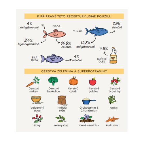 Složení: čerstvý losos 14,6 %, extrudovaná rýže, dehydrovaný tuňák 12,3 %, celý zelený hrášek, čerstvý tuňák 7,9 %, celozrnná rýže 7,9 %, celozrnný ječmen 6,3 %, kuřecí olej (chráněno přírodními tokoferoly) 4,6 %, dehydrovaný losos 4 %, čerstvé bílé ryby 4 %, celozrnný oves 3,5 %, rýžový protein, lososový hydrolyzát 2,4 %, lněné semínko (přírodní zdroj mastných kyselin ω3) 0,5 %, řepné řízky, jablečná vláknina, kvasnice (Saccharomyces cerevisiae), minerální látky, čerstvá brokolice 1000 mg/kg, čerstvá dýně 1000 mg/kg, čerstvá jablka 1000 mg/kg, čerstvá mrkev 1000 mg/kg, glukosamin 1000 mg/kg, chondroitin 600 mg/kg, hydrolyzovaná buněčná stěna kvasnic (zdroj MOS) 500 mg/kg, čekanka (zdroj FOS) 500 mg/kg, výtažek z mandarinky 500 mg/kg, Yucca schidigera 200 mg/ kg, řasa Kelpa 30 mg/kg, klikva celé plody 30 mg/kg, šípky (bohaté na vitamín C) 30 mg/kg, zelený čaj 30 mg/kg, kurkuma 30 mg/kg.