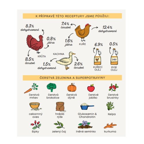 Složení: dehydrované kuřecí 12,4 %, čerstvá vykostěná krůta 8,5 %, extrudovaná rýže, celý zelený hrášek, dehydrovaná krůta, celozrnný oves 8,3 %, celozrnná rýže 8 %, kuřecí olej (chráněno přírodními tokoferoly) 6,9 %, celý žlutý hrášek, čerstvé vykostěné kuřecí 4,1 %, celozrnný ječmen 4,1 %, čerstvá kuřecí játra 3,3 %, čerstvá vykostěná kachna 2,6 %, hydrolyzát z kuřecích jater 1,6 %, dehydrovaná kachna 1,5 %, řepné řízky, jablečná vláknina, hydrolyzát z krůtích jater 0,8 %, minerální látky, lněné semínko (přírodní zdroj mastných kyselin ω3) 0,5 %, rybí olej (chráněno přírodními tokoferoly) 0,5 %, kvasnice (Saccharomyces cerevisiae), čerstvá brokolice 1000 mg/kg, čerstvá dýně 1000 mg/kg, čerstvá jablka 1000 mg/kg, čerstvá mrkev 1000 mg/kg, glukosamin 1000 mg/kg, chondroitin 600 mg/kg, hydrolyzovaná buněčná stěna kvasnic (zdroj MOS) 500 mg/kg, čekanka (zdroj FOS) 500 mg/kg, výtažek z mandarinky 400 mg/kg, Yucca schidigera 200 mg/ kg, Řasa Kelpa 30 mg/kg, klikva celé plody 30 mg/kg, šípky (bohaté na vitamín C) 30 mg/kg, zelený čaj 30 mg/kg, kurkuma 30 mg/kg.