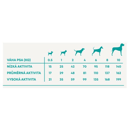 Krmný návod: změnu krmiva je třeba provádět postupně po dobu 7 dní. Jako návod použijte tabulku s dávkováním. Denní množství potravy se může pro každého psa lišit, záleží na úrovni jeho aktivity, plemeni a podmínkách prostředí. Denní krmnou dávku podávejte přednostně rozdělenou na 2 až 3 porce denně, a to vždy ve stejnou dobu. Pes musí mít vždy přístup k čisté, čerstvé vodě. Skladování: skladujte na chladném a suchém místě. Obal by měl být po použití vždy bezpečně uzavřen.