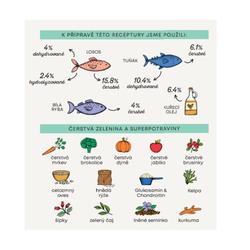 Složení: čerstvý losos 15,8 %, celý zelený hrášek, dehydrovaný tuňák 10,4 %, extrudovaná rýže, čerstvý tuňák 6,1 %, celozrnná rýže, kuřecí olej (chráněno přírodními tokoferoly) 6,4 %, hráškový protein, celozrnný ječmen, dehydrovaný losos 4 %, čerstvé bílé ryby 4 %, rýžový protein, celozrnný oves, lososový hydrolyzát 2,4 %, lněné semínko (přírodní zdroj mastných kyselin ω3), řepné řízky, jablečná vláknina, kvasnice (Saccharomyces cerevisiae), minerální látky, čerstvá brokolice 1000 mg/kg, čerstvá dýně 1000 mg/kg, čerstvá jablka 1000 mg/kg, čerstvá mrkev 1000 mg/kg, glukosamin 1000 mg/kg, chondroitin 600 mg/kg, hydrolyzovaná buněčná stěna kvasnic (zdroj MOS) 500 mg/kg, čekanka (zdroj FOS) 500 mg/kg, výtažek z mandarinky 500 mg/kg, Yucca schidigera 200 mg/kg, řasa Kelpa 30 mg/kg, klikva celé plody 30 mg/kg, šípky (bohaté na vitamín C) 30 mg/kg, zelený čaj 30 mg/kg, kurkuma 30 mg/kg.